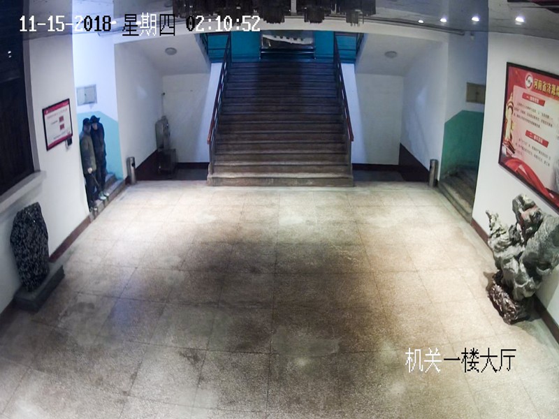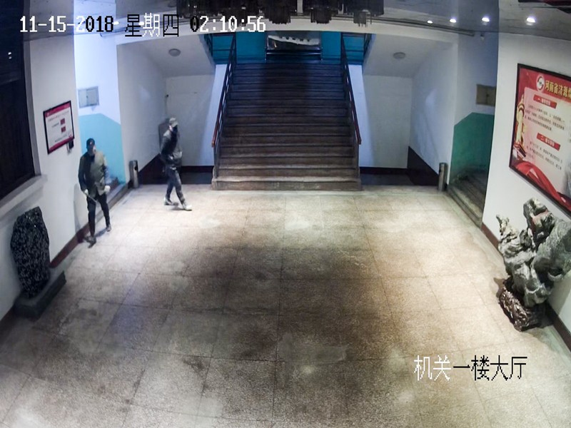 视频监控显示:11月15日凌晨1点56分,两名犯罪嫌疑人从南办公楼一楼破窗进入,凌晨2点03分进入老办公楼大厅,凌晨2点40分撬开财务部出纳室的防盗门,凌晨2点54分从老办公楼逃离,进入南办公楼。凌晨3点03分犯罪嫌疑人到达出纳室后窗外。